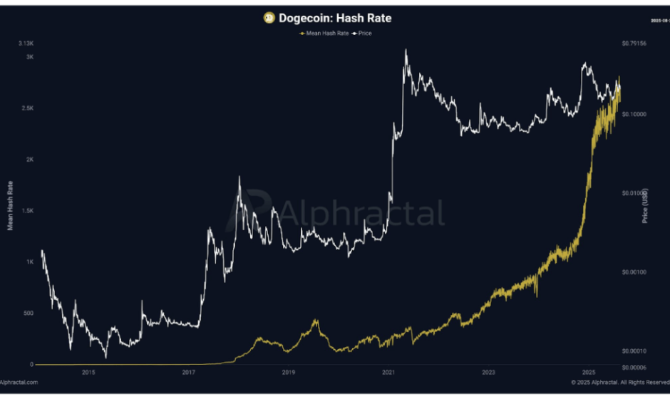 Another factor is the Dogecoin mining hash rate chart. As shown in the image below, the hash rate has been rising massively since the beginning of 2025, showing that network strength has been steadily climbing even during price consolidations and declines.