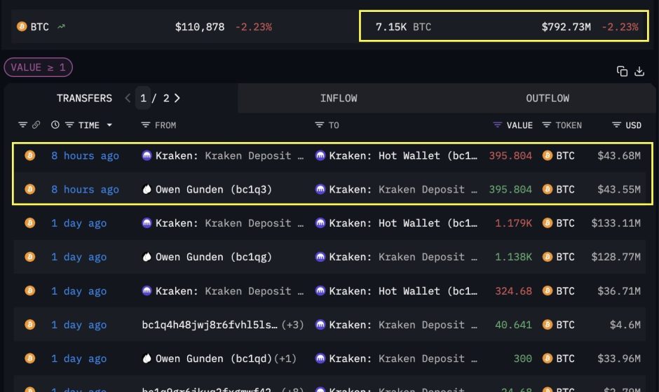 As spotted by on-chain data analytics platform, Spot on Chain, two major whales have offloaded Bitcoin and Ethereum following the recent market drop. Among them, Owen Gunden, a well-known early Bitcoin investor, recently transferred 395.8 BTC, worth about $43.7 million, to Kraken earlier today.