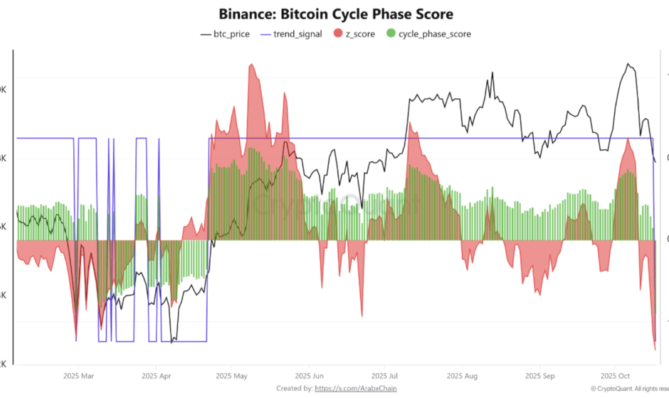 According to a CryptoQuant QuickTake post by contributor Arab Chain, Bitcoin is currently undergoing an important transition phase within its market cycle. The Bitcoin Cycle Phase Score recently entered negative territory, in tandem with a decline in BTC’s price from $124,000 to around $107,000 within 24 hours.