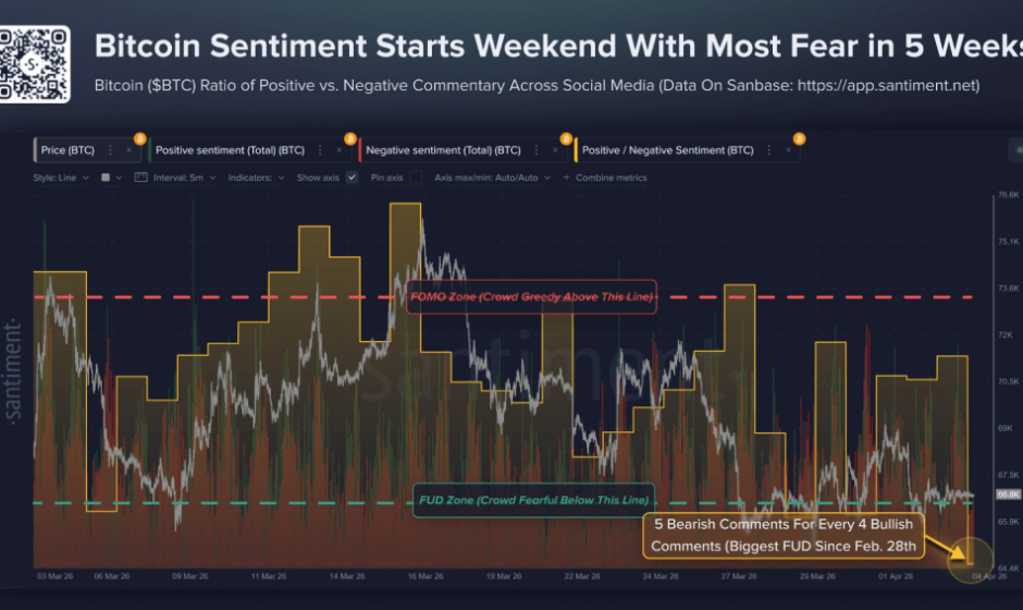 Social chatter around Bitcoin has weakened fast. Data from Santiment shows the bullish-to-bearish ratio has slipped to 0.81 to 1.00, its lowest reading since February 28.