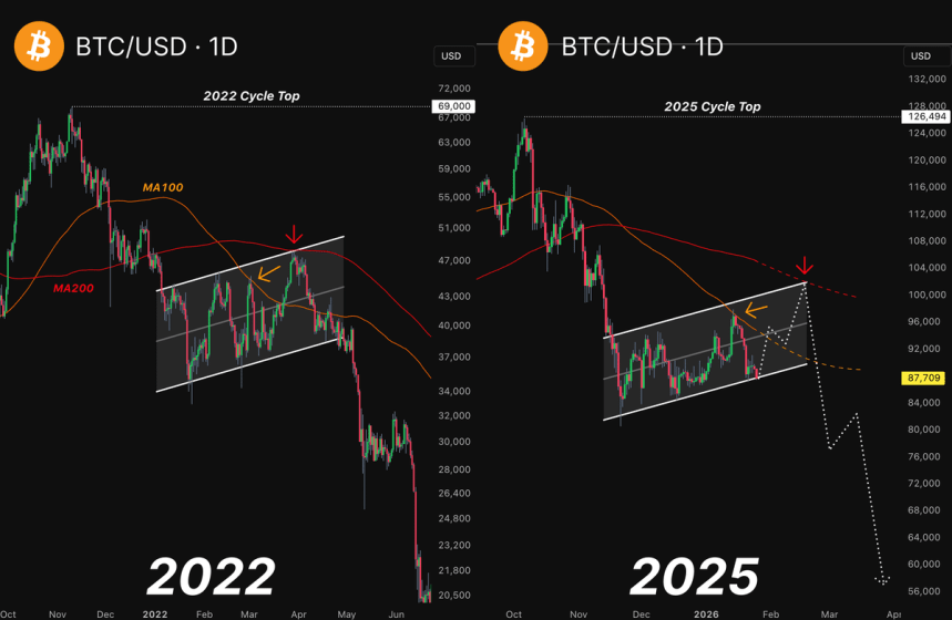 Amid this performance, Market observer Philarekt affirmed that Bitcoin is repeating its 2022 playbook, highlighting the similarities between the leading crypto’s performance at the start of the last bear market and its current price action.