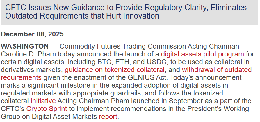 The U.S. Commodity Futures Trading Commission (CFTC) has introduced a new digital assets pilot program on December 8 that reshapes access to crypto-backed margin in regulated derivatives markets. This move allows Bitcoin (BTC), Ether (ETH), and USDC to serve as tokenized collateral in an initial three-month phase.
