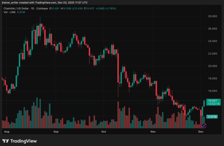 Chainlink (LINK) is once again in the spotlight across the cryptosphere after the launch of the first U.S. Chainlink-focused ETF sparked a sharp price rebound and renewed institutional interest. LINK surged more than 20% in 24 hours, trading around $14.4 as volumes and market participation accelerated.