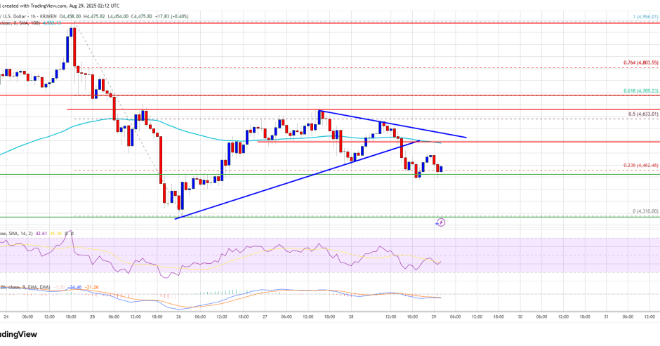 Ethereum price is now trading below $4,550 and the 100-hourly Simple Moving Average. On the upside, the price could face resistance near the $4,550 level. The next key resistance is near the $4,600 level. The first major resistance is near the $4,630 level.