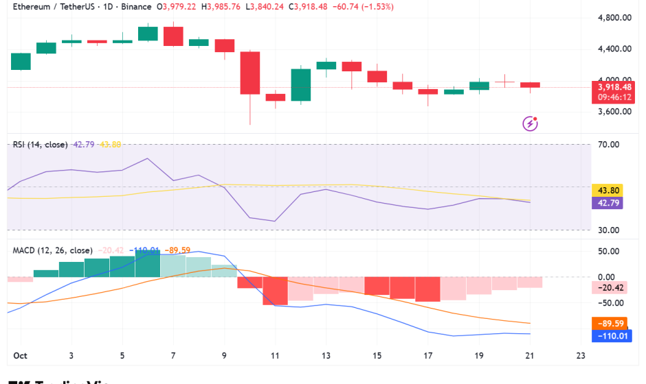 With the latest drop, Ethereum now seems to be stuck below $4,000. Furthermore, technical indicators including the relative strength index (RSI) and moving average convergence divergence (MACD) hint at a possible stagnation around the current level. The RSI, for instance, sits at 42.79 showing a bearish momentum on the price.