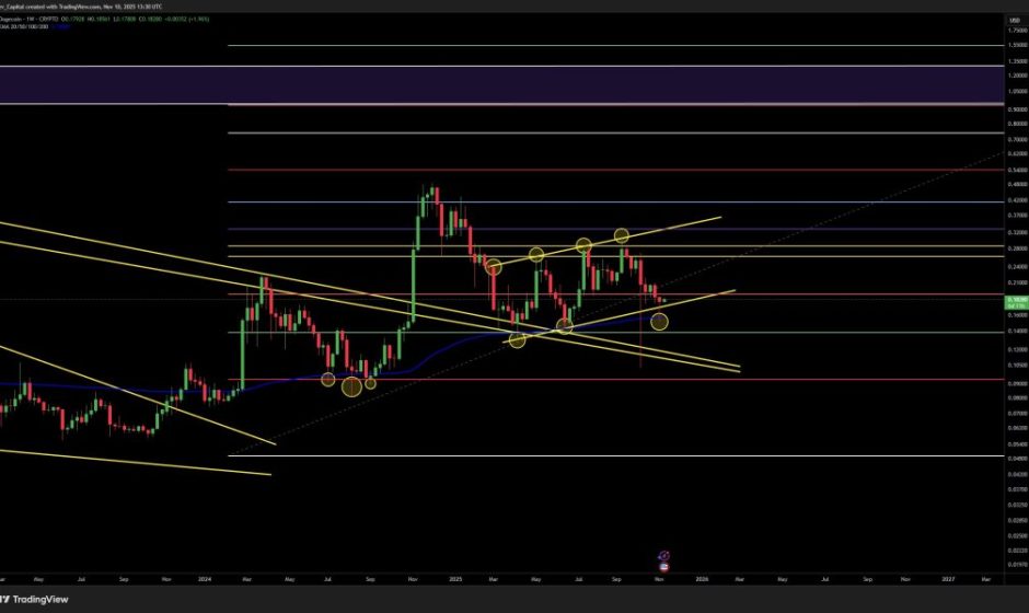The weekly 200 EMA has preserved Dogecoin’s bullish structure six separate times since last summer. It’s still rising and, for now, remains the bulls’ final line of defense. Above that, the primary framework is a tight, upward-tilting channel bounded by two yellow rails, with multiple circled touches validating both support and resistance along the way.Price printed a long downside wick into the lower rail, then bounced, effectively defending the channel and the 200-week average in the $0.16 area.