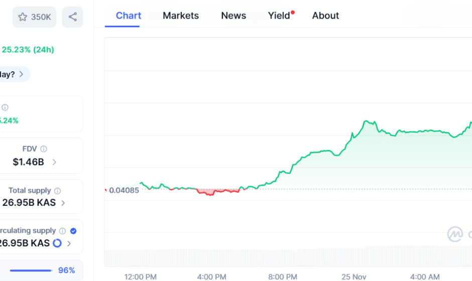 Kaspa has jumped by 25% over the past 24 hours as traders rotate back into high-beta assets after fresh signals of possible December rate cuts from the Federal Reserve. This move comes as Bitcoin and Ethereum post only small gains in the same period.
