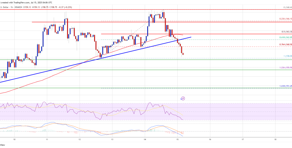 Besides, there was a break below a key bullish trend line with support at $162 on the hourly chart of the SOL/USD pair. Solana is now trading below $162 and the 100-hourly simple moving average. It is also trading below the 76.4% Fib retracement level of the upward move from the $158 swing low to the $168 high.
