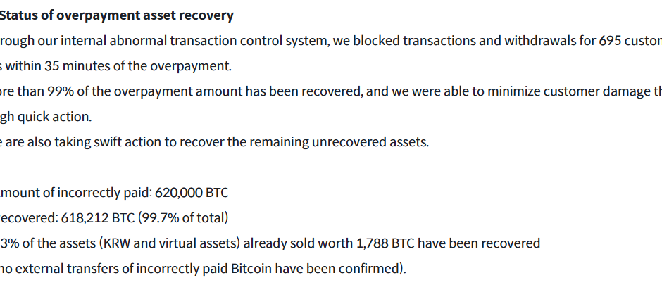 Bithumb insists that it recovered most of the miscredited Bitcoin and claims customers suffered no losses. The exchange still cannot account for roughly 125 Bitcoin, about $8.6 million, which remains unresolved.