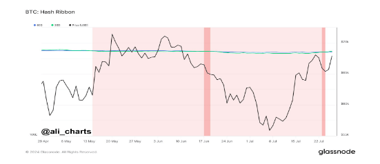 Crypto analyst Ali Martinez highlighted an intriguing phenomenon with the hash ribbon indicator on social media platform X. As noted by the analyst, the hash ribbon is signaling the end of miner capitulation, which suggests that the BTC price momentum has shifted from negative to positive.