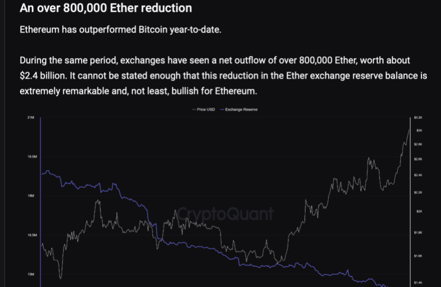According to data from CryptoQuant, over 800,000 ETH, equivalent to roughly $2.4 billion, has exited cryptocurrency exchanges since the beginning of the year. Such substantial outflows from these platforms typically indicate a surge in investor confidence in the Ethereum network and its native token.