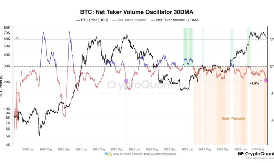 According to the Bitcoin Net Taker Oscillator indicator, the reading is -1.5%. At this level, it is at the same point observed when prices rocketed to as high as $70,000 in November 2021 before dumping sharply throughout 2022.