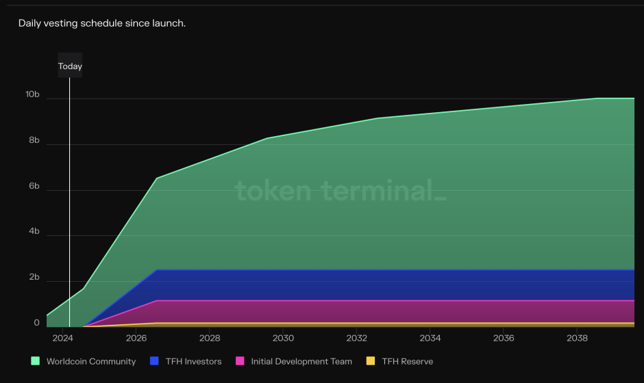 Worldcoin has a 15-year vesting schedule, which includes the distribution of tokens to the WLD community, TFH investors, initial development team and TFH reserve.