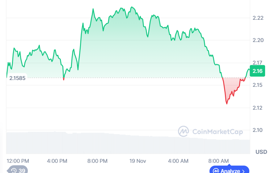 The drop to $2.12 marks a key support test. All major moving averages from the 10-day to the 200-day point toward ongoing selling. The relative strength index sits at 38, which signals weak but neutral momentum. A push above $2.30, followed by a clean break over $2.56, would improve the near-term setup. That move could reopen a path toward the $2.80–$3.00 zone if demand returns. Failure to defend $2.12 puts $1.80 at risk. Stronger selling could even drag the price back toward $1.60, where buyers stepped in last time.